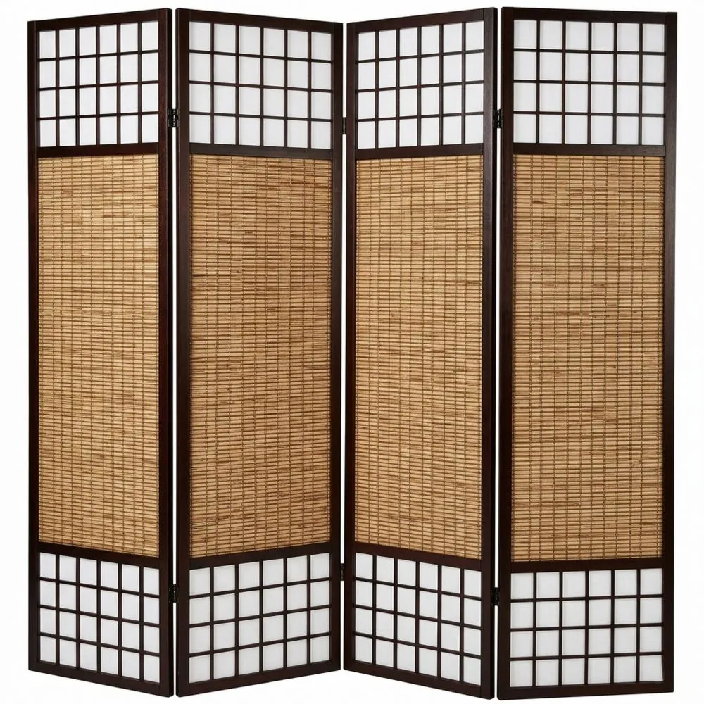 Biombo de Madera de 4 Paneles en Color Castaño con Bambú
