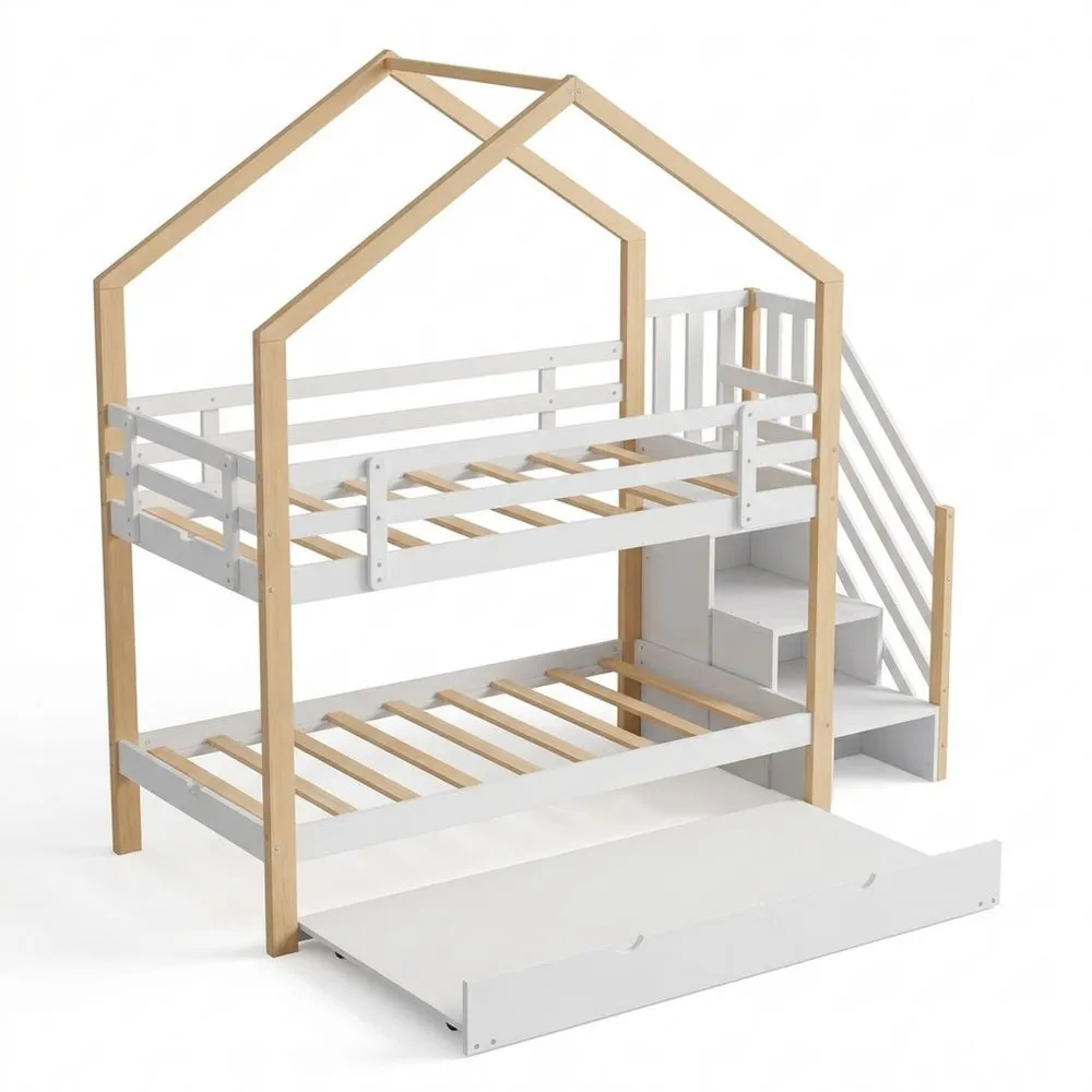 Cama de madera maciza y MDF, ofrece un aspecto cálido y natural al cuarto infantil. El techo es adecuado para luces decorativas o adornos favoritos. La estructura sólida soporta hasta 120 kg. ESCALERA DE ALMACENAMIENTO: La escalera integrada facilita el acceso. Los peldaños esconden cajones prácticos para juguetes, libros o ropa. Mantiene el suelo libre y el cuarto ordenado. CAMA NIDO DESLIZANTE 90 x 190 cm: La cama plegable se extiende fácilmente cuando es necesario, proporcionando espacio adicional para dormir. Durante el día, se guarda bajo la cama principal. BARANDILLA Y BASES SÓLIDAS: La barandilla protege la litera superior. Las bases del colchón son densas, proporcionando un soporte estable para el colchón.