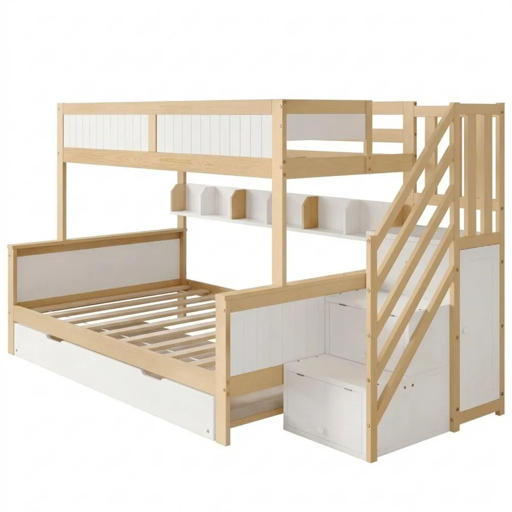 Las escaleras de almacenamiento integradas en la litera no solo sirven para subir y bajar, sino que también incluyen cuatro armarios amplios para guardar ropa, juguetes u otros artículos personales.