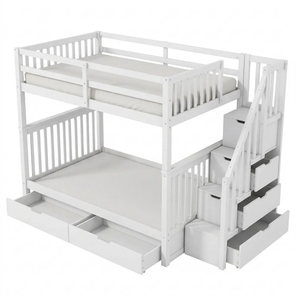 La estructura de la cama está hecha de madera de pino y tablero de fibra de densidad media, lo que garantiza estabilidad y resistencia. Los dos cajones debajo de la cama y las estanterías en las escaleras ofrecen espacio de almacenamiento. Las barandillas altas proporcionan un entorno seguro para el descanso. El diseño en color blanco permite integrarse fácilmente en diferentes estilos de decoración.