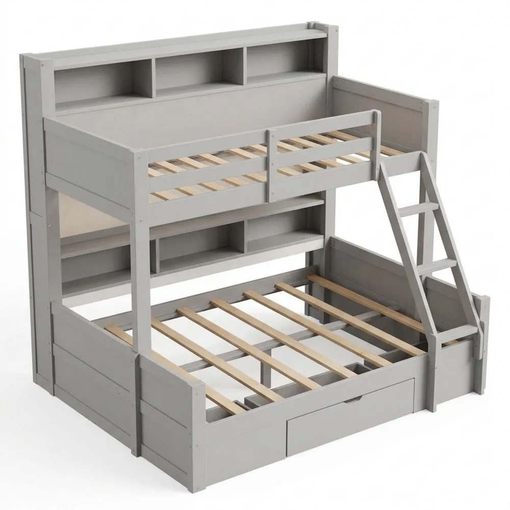 Este producto proporciona un espacio óptimo para dormir con camas de varios tamaños, adecuándose al crecimiento de los niños. Las luces LED iluminan ambas camas con diferentes modos para crear un ambiente acogedor. Tiene compartimentos de almacenamiento abiertos y un cajón bajo la cama para maximizar el uso del espacio. La escalera se puede instalar según las necesidades del usuario. Barreras resistentes rodean la cama superior para mayor seguridad.
